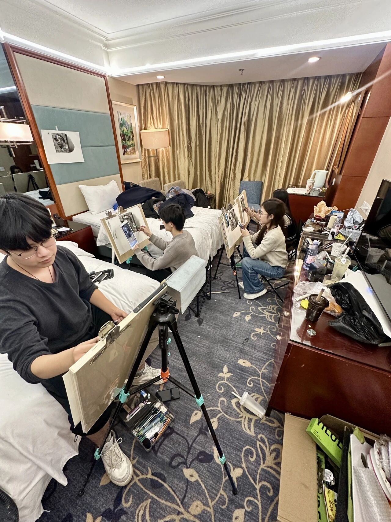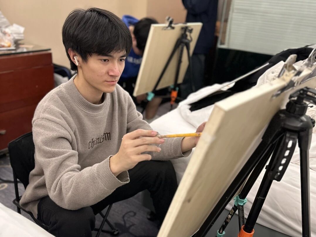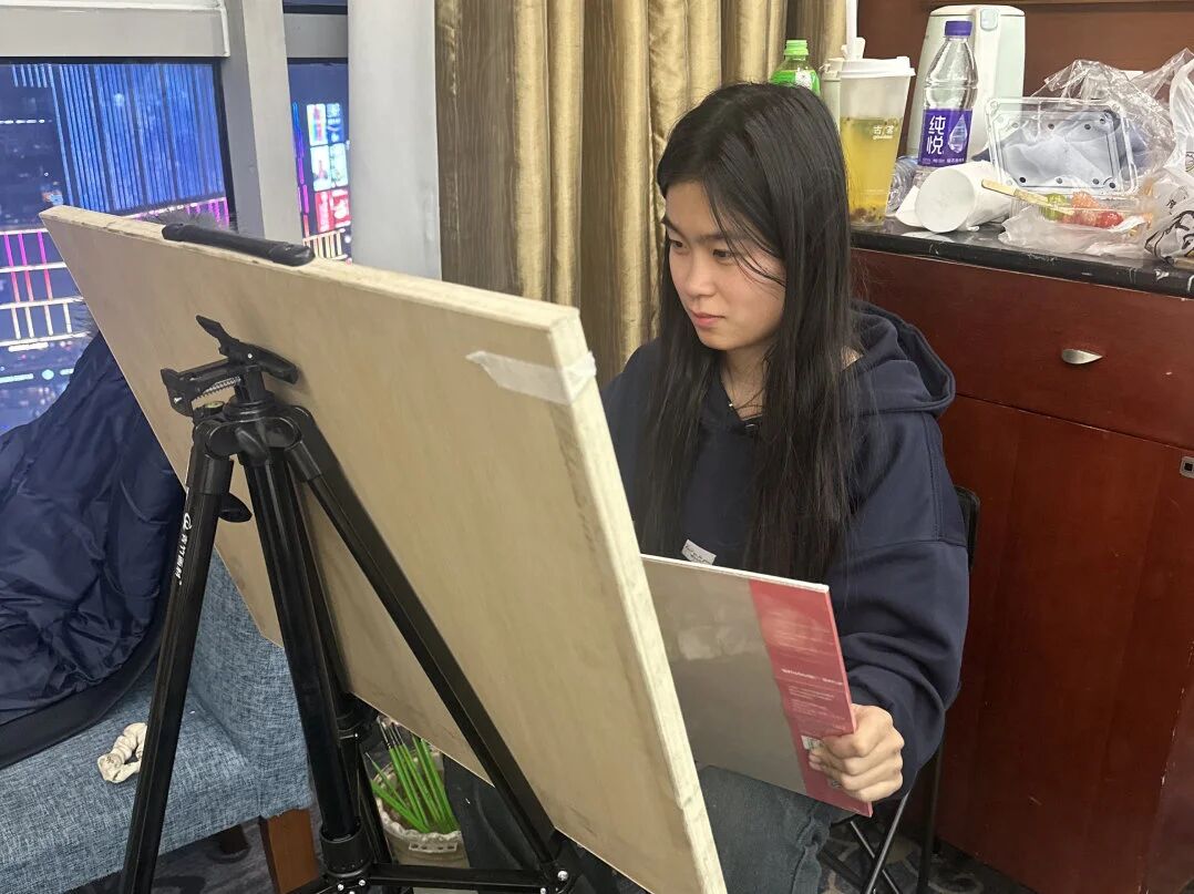 清木画室的老师们带领学子出征奔赴联考。酒店虽然拥挤,但大家摆上画架就进入了学习模式。考前的每一分钟都很宝贵,临阵磨枪不亮也光。
