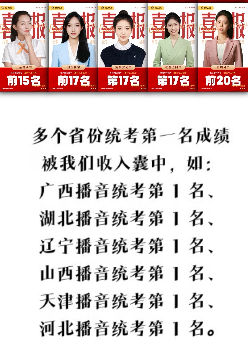 不仅如此,中影人犀牛播音的很多学员也取得了各自省份名列前茅的好成绩。