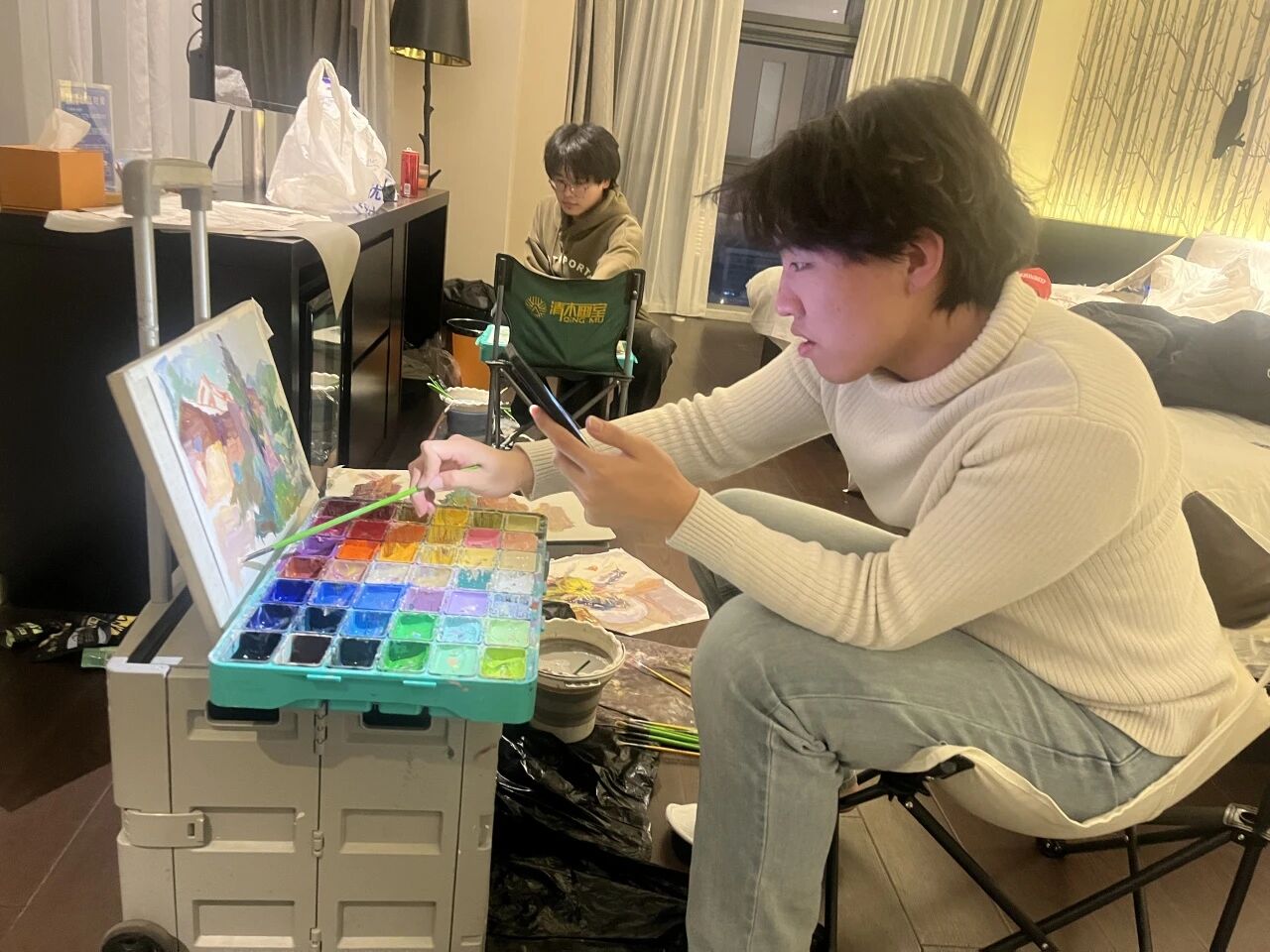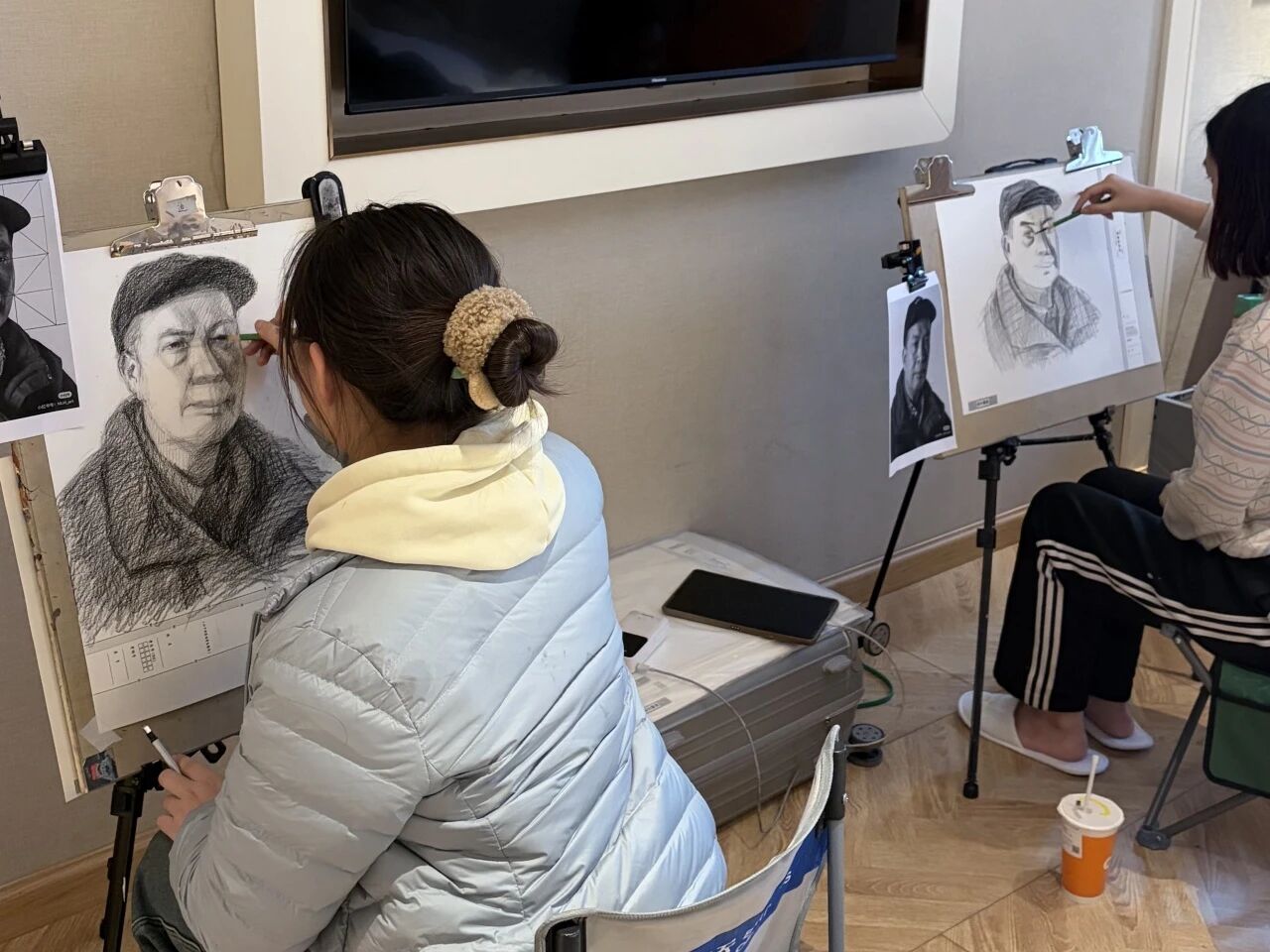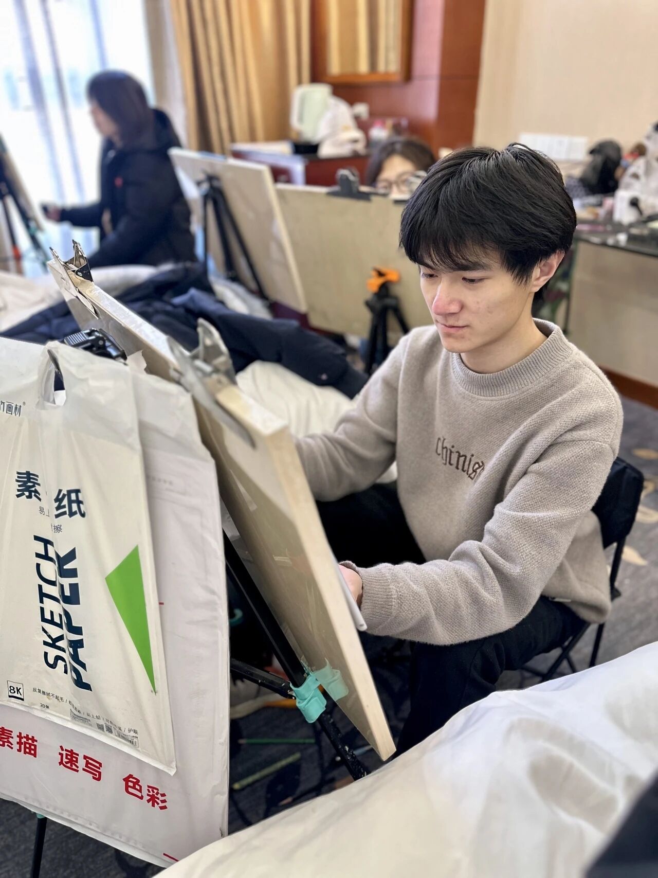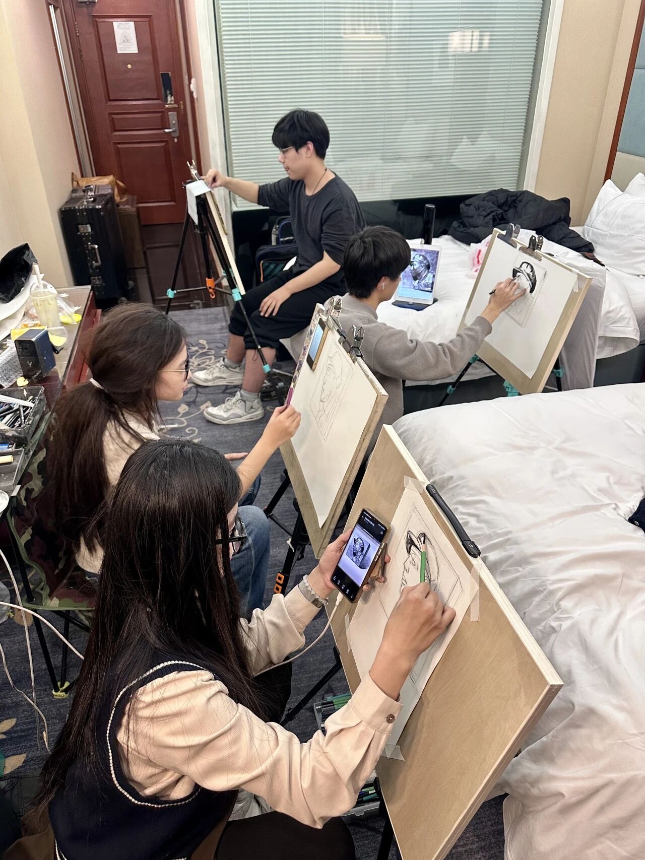 清木画室的老师们带领学子出征奔赴联考。酒店虽然拥挤,但大家摆上画架就进入了学习模式。考前的每一分钟都很宝贵,临阵磨枪不亮也光。